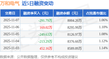证券之星消息,11月7日,万和电气(002543)融资买入324.53万元,融资偿还616.32万元,融资净卖出291.79万元,融资余额8004.2万元,近20个交易日中有12个交易日出现融资净买入。