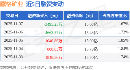 证券之星消息,11月7日,藏格矿业(000408)融资买入5957.5万元,融资偿还9452.75万元,融资净卖出3495.25万元,融资余额15.08亿元,近20个交易日中有11个交易日出现融资净买入。