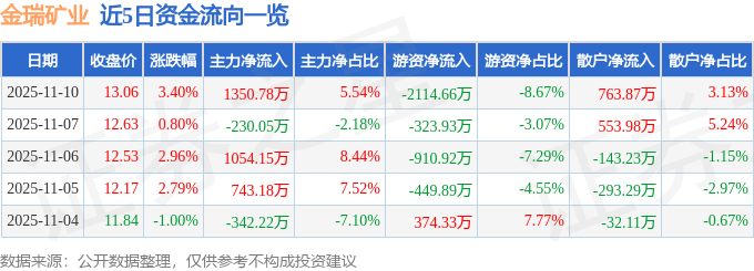 证券之星消息,截至2025年11月10日收盘,金瑞矿业(600714)报收于13.06元,上涨3.4%,换手率6.42%,成交量18.5万手,成交额2.44亿元。