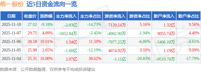 证券之星消息,截至2025年11月10日收盘,统一股份(600506)报收于27.02元,下跌9.18%,换手率33.85%,成交量50.0万手,成交额13.79亿元。