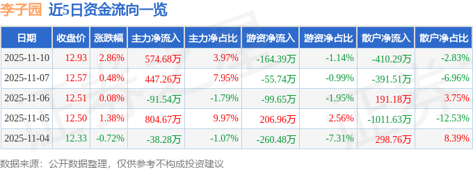 证券之星消息,截至2025年11月10日收盘,李子园(605337)报收于12.93元,上涨2.86%,换手率2.9%,成交量11.3万手,成交额1.45亿元。