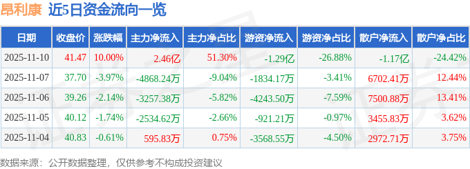证券之星消息,截至2025年11月10日收盘,昂利康(002940)报收于41.47元,上涨10.0%,涨停,换手率6.31%,成交量11.7万手,成交额4.79亿元。