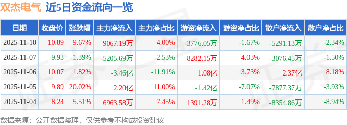 证券之星消息,截至2025年11月10日收盘,双杰电气(300444)报收于10.89元,上涨9.67%,换手率34.83%,成交量216.42万手,成交额22.64亿元。