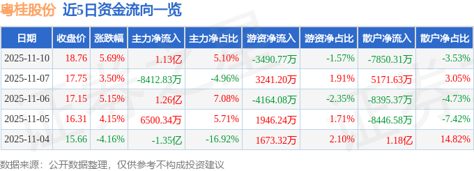证券之星消息,截至2025年11月10日收盘,粤桂股份(000833)报收于18.76元,上涨5.69%,换手率25.83%,成交量117.21万手,成交额22.25亿元。