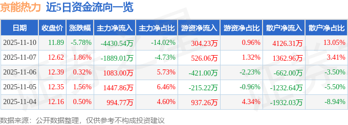 证券之星消息,截至2025年11月10日收盘,京能热力(002893)报收于11.89元,下跌5.78%,换手率13.04%,成交量26.45万手,成交额3.16亿元。