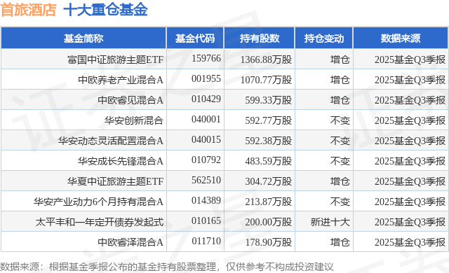 根据2025基金Q3季报公募基金重仓股数据,重仓该股的公募基金共17家,其中持有数量最多的公募基金为富国基金的富国中证旅游主题ETF。富国中证旅游主题ETF目前规模为49.27亿元,最新净值0.7523(11月7日),较上一交易日上涨0.94%,近一年上涨0.05%。该公募基金现任基金经理为曹璐迪。曹璐迪在任的基金产品包括:富国中证价值ETF联接A,管理时间为2020年5月20日至今,期间收益率为112.45%;富国中证价值ETF,管理时间为2020年5月20日至今,期间收益率为122.45%;富国创业板ETF,管理时间为2020年8月6日至今,期间收益率为13.91%;富国中证科创创业50ETF,管理时间为2021年6月29日至今,期间收益率为-5.23%。