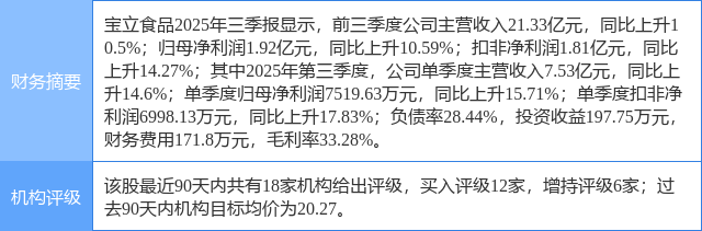 今日宝立食品(603170)涨6.04%,收盘报16.16元。