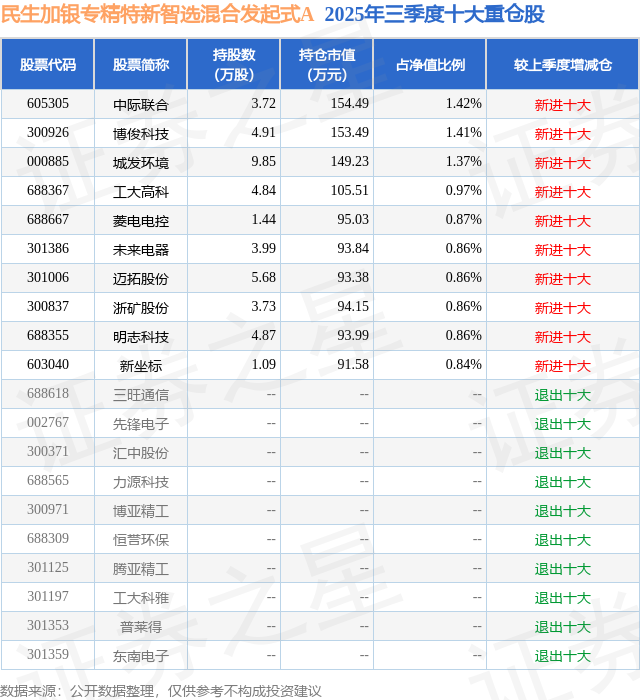 民生加银专精特新智选混合发起式A的前十大重仓股如下: