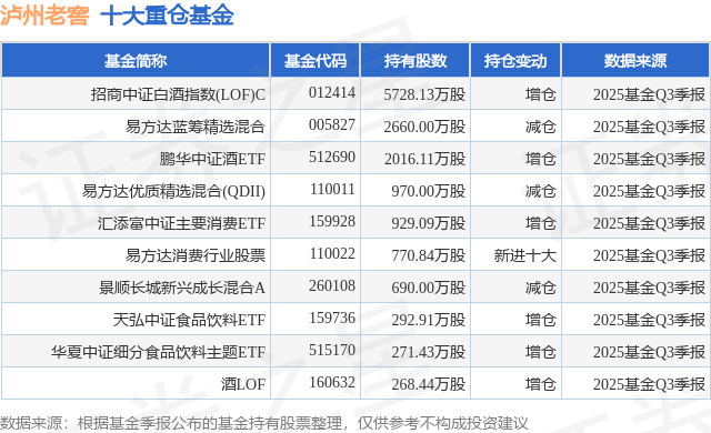 根据2025基金Q3季报公募基金重仓股数据,重仓该股的公募基金共134家,其中持有数量最多的公募基金为招商基金的招商中证白酒指数(LOF)C。招商中证白酒指数(LOF)C目前规模为150.16亿元,最新净值0.7652(11月7日),较上一交易日下跌0.31%,近一年下跌18.24%。该公募基金现任基金经理为侯昊。侯昊在任的基金产品包括:招商大宗商品(LOF),管理时间为2017年9月5日至今,期间收益率为66.47%;招商中证银行指数A,管理时间为2017年9月5日至今,期间收益率为80.65%;招商深证100指数A,管理时间为2017年9月5日至今,期间收益率为71.82%;招商央视财经50指数A,管理时间为2017年9月5日至今,期间收益率为79.29%。