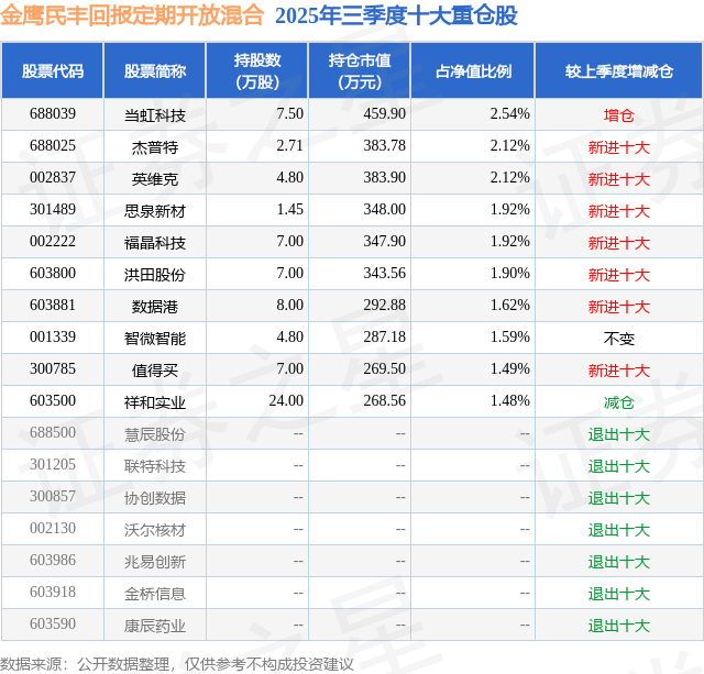 根据2025基金Q3季报公募基金重仓股数据,重仓该股的公募基金共1家,其中持有数量最多的公募基金为金鹰基金的金鹰民丰回报定期开放混合。金鹰民丰回报定期开放混合目前规模为1.81亿元,最新净值1.1401(11月7日),较上一交易日下跌0.45%,近一年上涨21.73%。该公募基金现任基金经理为林龙军。林龙军在任的基金产品包括:金鹰鑫益混合A,管理时间为2018年5月17日至今,期间收益率为37.05%;金鹰持久增利债券(LOF)C,管理时间为2018年5月17日至今,期间收益率为54.2%;金鹰元丰债券A,管理时间为2018年5月17日至今,期间收益率为73.31%;金鹰元祺债券A,管理时间为2018年6月2日至今,期间收益率为58.24%。