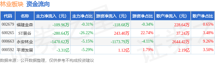 从资金流向上来看,当日林业板块主力资金净流出3.5亿元,游资资金净流入1.02亿元,散户资金净流入2.48亿元。林业板块个股资金流向见下表: