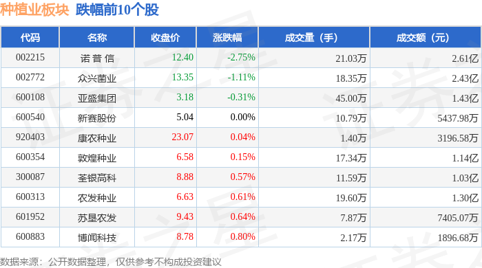 证券之星消息,11月10日种植业板块较上一交易日上涨0.96%,宏辉果蔬领涨。当日上证指数报收于4018.6,上涨0.53%。深证成指报收于13427.61,上涨0.18%。种植业板块个股涨跌见下表: