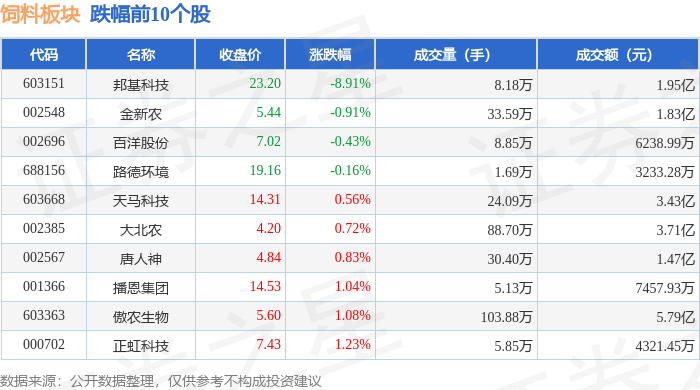 从资金流向上来看,当日饲料板块主力资金净流出718.75万元,游资资金净流入7775.59万元,散户资金净流出7056.83万元。饲料板块个股资金流向见下表:
