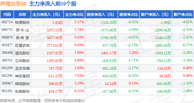 从资金流向上来看,当日养殖业板块主力资金净流入2.53亿元,游资资金净流出1.02亿元,散户资金净流出1.51亿元。养殖业板块个股资金流向见下表: