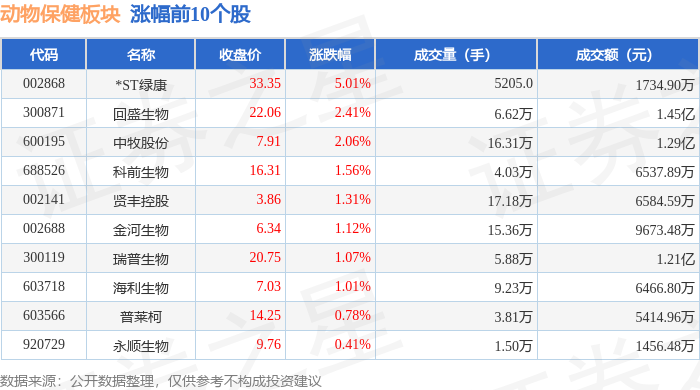 证券之星消息,11月10日动物保健板块较上一交易日上涨1.24%,*ST绿康领涨。当日上证指数报收于4018.6,上涨0.53%。深证成指报收于13427.61,上涨0.18%。动物保健板块个股涨跌见下表: