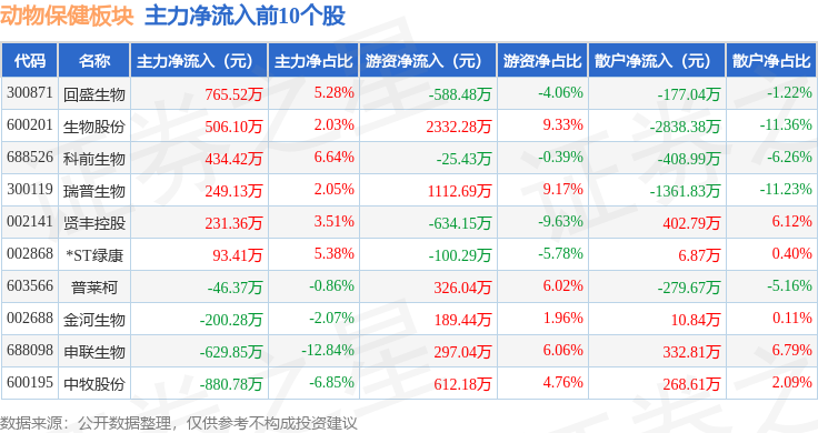 从资金流向上来看,当日动物保健板块主力资金净流出996.27万元,游资资金净流入3961.58万元,散户资金净流出2965.31万元。动物保健板块个股资金流向见下表: