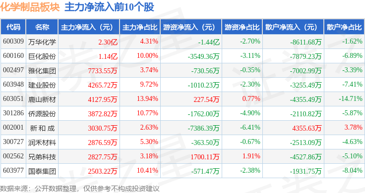 从资金流向上来看,当日化学制品板块主力资金净流出15.74亿元,游资资金净流入1.5亿元,散户资金净流入14.24亿元。化学制品板块个股资金流向见下表:
