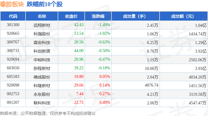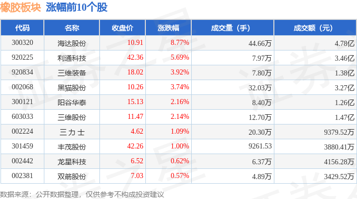 证券之星消息,11月10日橡胶板块较上一交易日上涨1.15%,海达股份领涨。当日上证指数报收于4018.6,上涨0.53%。深证成指报收于13427.61,上涨0.18%。橡胶板块个股涨跌见下表: