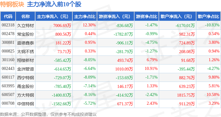 从资金流向上来看,当日特钢板块主力资金净流出2749.59万元,游资资金净流出1796.19万元,散户资金净流入4545.78万元。特钢板块个股资金流向见下表: