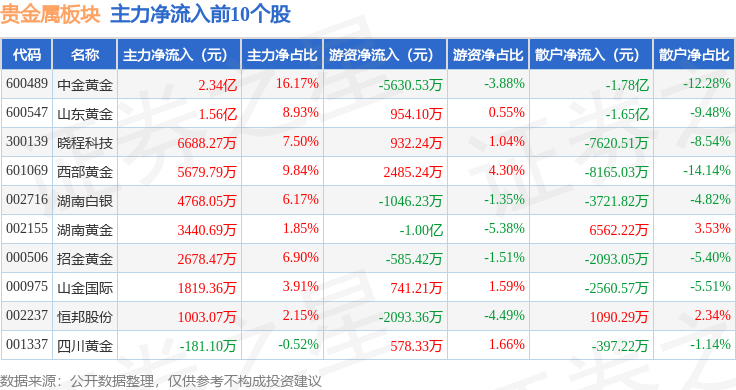 从资金流向上来看,当日贵金属板块主力资金净流入6.08亿元,游资资金净流出6630.83万元,散户资金净流出5.42亿元。贵金属板块个股资金流向见下表: