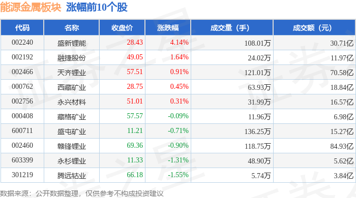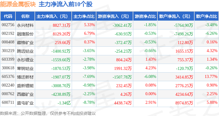 从资金流向上来看,当日能源金属板块主力资金净流出10.03亿元,游资资金净流出314.06万元,散户资金净流入10.06亿元。能源金属板块个股资金流向见下表: