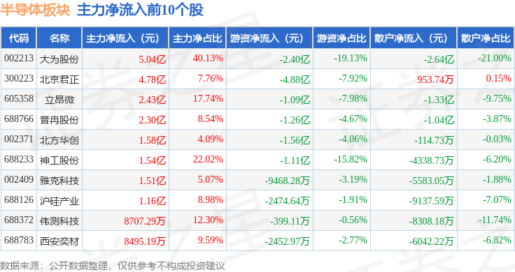 从资金流向上来看,当日半导体板块主力资金净流出32.06亿元,游资资金净流入15.06亿元,散户资金净流入17.01亿元。半导体板块个股资金流向见下表: