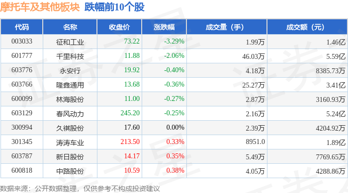证券之星消息,11月10日摩托车及其他板块较上一交易日下跌0.25%,征和工业领跌。当日上证指数报收于4018.6,上涨0.53%。深证成指报收于13427.61,上涨0.18%。摩托车及其他板块个股涨跌见下表: