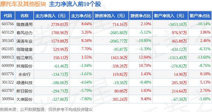 从资金流向上来看,当日摩托车及其他板块主力资金净流出3549.67万元,游资资金净流入1184.71万元,散户资金净流入2364.96万元。摩托车及其他板块个股资金流向见下表: