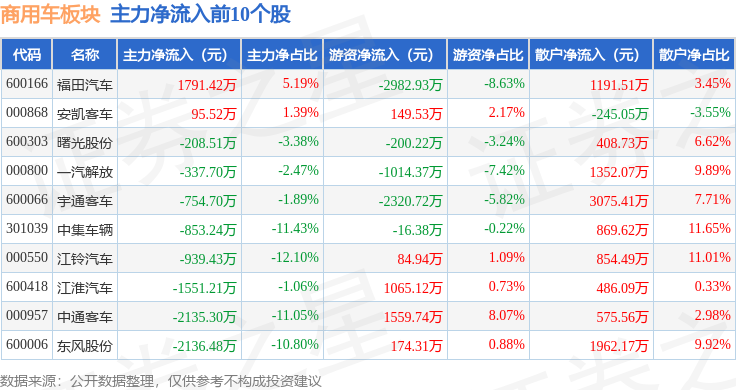 从资金流向上来看,当日商用车板块主力资金净流出1.74亿元,游资资金净流出7990.02万元,散户资金净流入2.54亿元。商用车板块个股资金流向见下表: