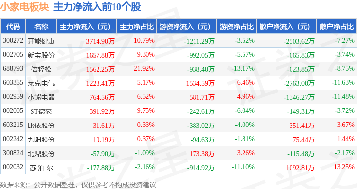 从资金流向上来看,当日小家电板块主力资金净流出2798.24万元,游资资金净流入754.37万元,散户资金净流入2043.87万元。小家电板块个股资金流向见下表: