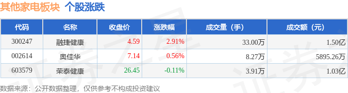 证券之星消息,11月10日其他家电板块较上一交易日上涨0.96%,融捷健康领涨。当日上证指数报收于4018.6,上涨0.53%。深证成指报收于13427.61,上涨0.18%。其他家电板块个股涨跌见下表: