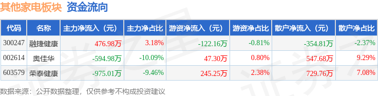 从资金流向上来看,当日其他家电板块主力资金净流出1093.02万元,游资资金净流入170.39万元,散户资金净流入922.63万元。其他家电板块个股资金流向见下表: