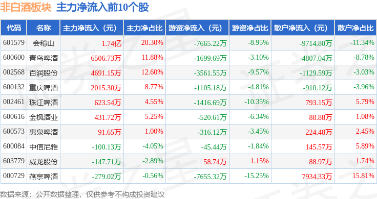 从资金流向上来看,当日非白酒板块主力资金净流入2.65亿元,游资资金净流出2.25亿元,散户资金净流出4032.9万元。非白酒板块个股资金流向见下表: