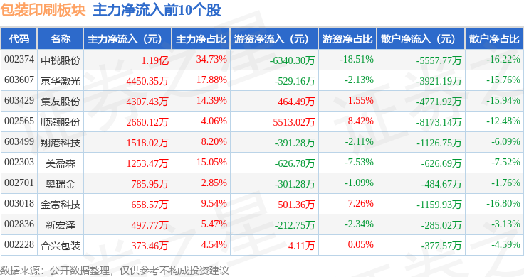 从资金流向上来看,当日包装印刷板块主力资金净流入8020.79万元,游资资金净流入4002.82万元,散户资金净流出1.2亿元。包装印刷板块个股资金流向见下表: