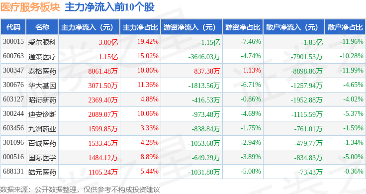 从资金流向上来看,当日医疗服务板块主力资金净流出1.85亿元,游资资金净流入1.01亿元,散户资金净流入8471.54万元。医疗服务板块个股资金流向见下表: