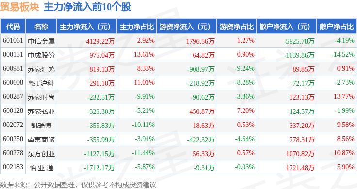 从资金流向上来看,当日贸易板块主力资金净流出6553.21万元,游资资金净流入1.74亿元,散户资金净流出1.09亿元。贸易板块个股资金流向见下表: