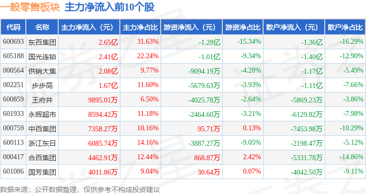 从资金流向上来看,当日一般零售板块主力资金净流入9.42亿元,游资资金净流出3.74亿元,散户资金净流出5.68亿元。一般零售板块个股资金流向见下表: