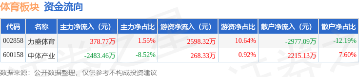 从资金流向上来看,当日体育板块主力资金净流出2104.7万元,游资资金净流入2866.66万元,散户资金净流出761.96万元。体育板块个股资金流向见下表: