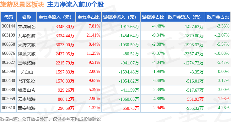 从资金流向上来看,当日旅游及景区板块主力资金净流入5334.72万元,游资资金净流出5504.02万元,散户资金净流入169.3万元。旅游及景区板块个股资金流向见下表: