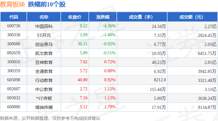 证券之星消息,11月10日教育板块较上一交易日上涨1.48%,科德教育领涨。当日上证指数报收于4018.6,上涨0.53%。深证成指报收于13427.61,上涨0.18%。教育板块个股涨跌见下表: