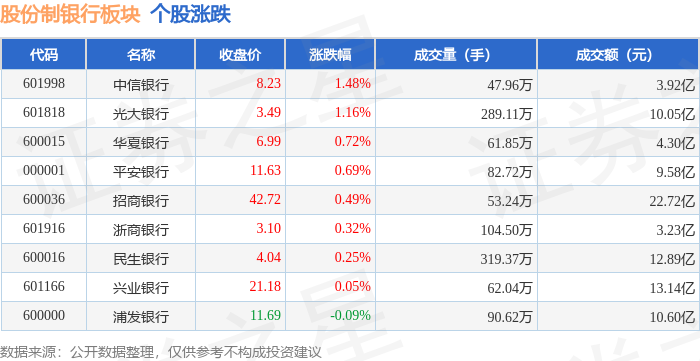 证券之星消息,11月10日股份制银行板块较上一交易日上涨0.5%,中信银行领涨。当日上证指数报收于4018.6,上涨0.53%。深证成指报收于13427.61,上涨0.18%。股份制银行板块个股涨跌见下表: