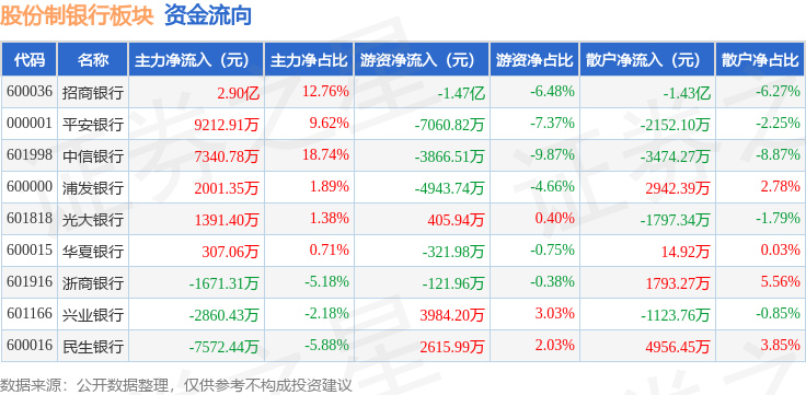 从资金流向上来看,当日股份制银行板块主力资金净流入3.71亿元,游资资金净流出2.4亿元,散户资金净流出1.31亿元。股份制银行板块个股资金流向见下表: