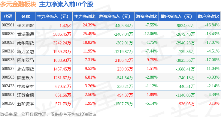 从资金流向上来看,当日多元金融板块主力资金净流出8936.64万元,游资资金净流出5052.87万元,散户资金净流入1.4亿元。多元金融板块个股资金流向见下表: