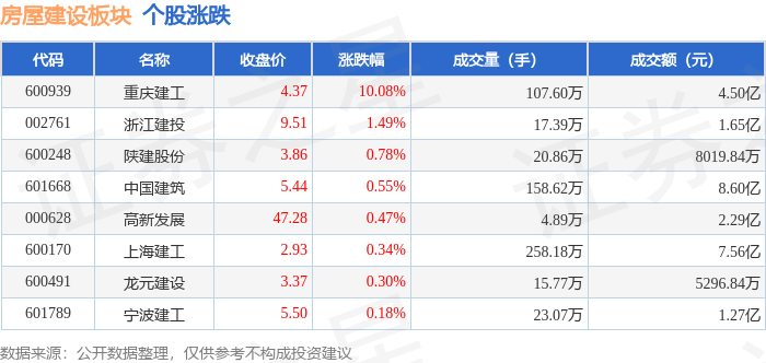 证券之星消息,11月10日房屋建设板块较上一交易日上涨0.8%,重庆建工领涨。当日上证指数报收于4018.6,上涨0.53%。深证成指报收于13427.61,上涨0.18%。房屋建设板块个股涨跌见下表: