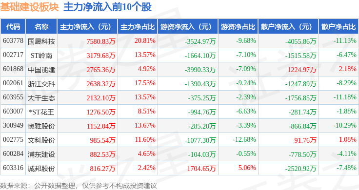 从资金流向上来看,当日基础建设板块主力资金净流出2.98亿元,游资资金净流出7642.94万元,散户资金净流入3.74亿元。基础建设板块个股资金流向见下表: