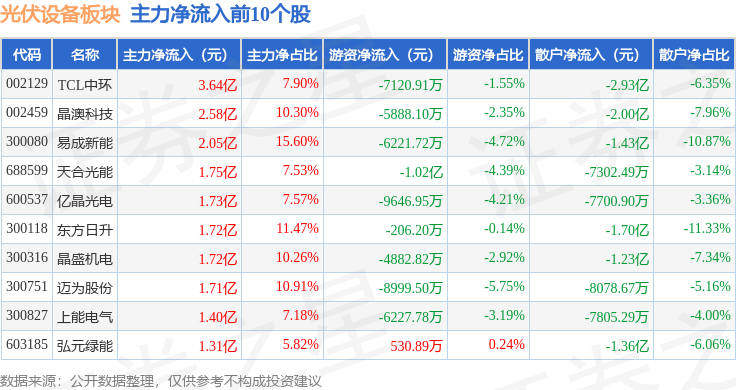 从资金流向上来看,当日光伏设备板块主力资金净流入6.47亿元,游资资金净流出3.89亿元,散户资金净流出2.59亿元。光伏设备板块个股资金流向见下表: