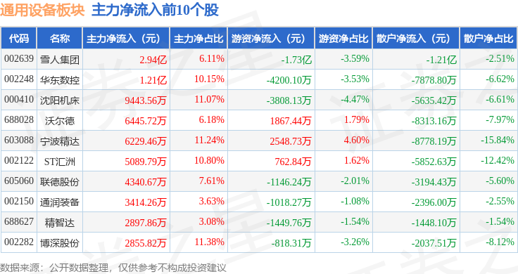 从资金流向上来看,当日通用设备板块主力资金净流出14.8亿元,游资资金净流入2475.24万元,散户资金净流入14.55亿元。通用设备板块个股资金流向见下表: