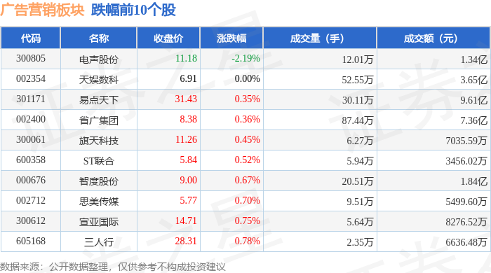 从资金流向上来看,当日广告营销板块主力资金净流入12.11亿元,游资资金净流出4.67亿元,散户资金净流出7.44亿元。广告营销板块个股资金流向见下表: