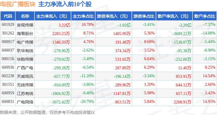 从资金流向上来看,当日电视广播板块主力资金净流入1.17亿元,游资资金净流出2175.24万元,散户资金净流出9488.57万元。电视广播板块个股资金流向见下表: