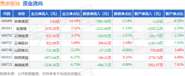 从资金流向上来看,当日焦炭板块主力资金净流入1.45亿元,游资资金净流出9729.03万元,散户资金净流出4762.94万元。焦炭板块个股资金流向见下表: